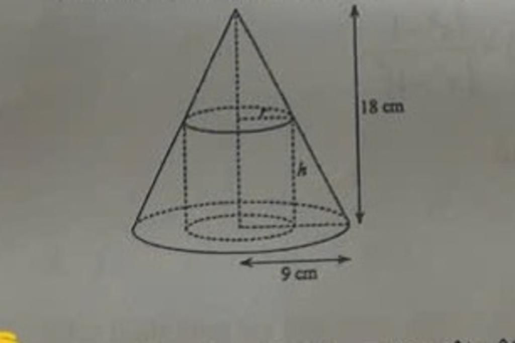 Hình bên cho biết một hình trụ bán kính đáy r(cm), chiều cao h(cm) nội tiếp hình nón có bán kính đáy 9 cm, chiều cao 18 cm. Tìm giá trị của r để thể tích của hình trụ là lớn nhất (kết quả làm tròn đến hàng đơn vị của cm).