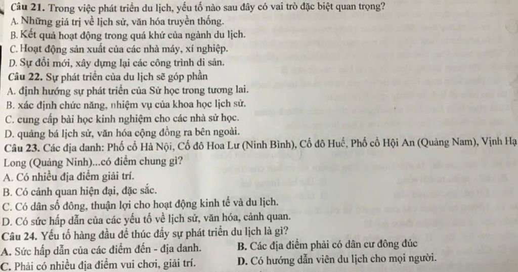`Câu 23:` Các địa danh: Phố cổ Hà Nội, Cố đô Hoa Lư (Ninh Bình), Cố đô Huế, Phố cổ Hội An (Quảng Nam), Vịnh Hạ Long (Quảng Ninh)...có điểm chung là: