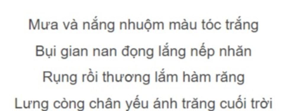 - Những chi tiết miêu tả người mẹ: tóc bạc trắng, đã có nhiều nếp nhăn, hàm răng dần rụng, lưng còng, chân yếu, “ánh trăng cuối trời”.