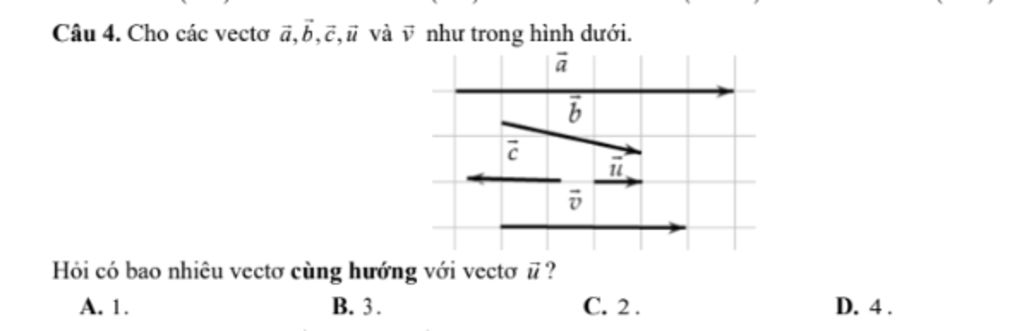 Vectơ cùng hướng với `\vec{u}` theo hình vẽ là : `\vec{a}` và `\vec{v}` , ngược hướng là `\vec{c},` khác hướng là `\vec{b}`