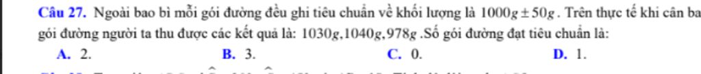 Câu 27. Ngoài bao bì mỗi gói đường đều ghi tiêu chuẩn về khối lượng là $1000 \mathrm{~g} \pm 50 \mathrm{~g}$. Trên thực tế khi cân ba gói đường người ta thu được các kết quả là: $1030 \mathrm{~g}, 1040 \mathrm{~g}, 978 \mathrm{~g}$.Số gói đường đạt tiêu chuẩn là: