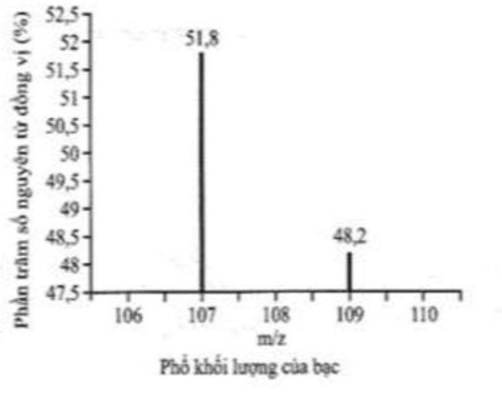 Trục tung biểu thị hàm lượng phần trăm về số nguyên tử của từng đồng vị, trục hoành biểu thị tỉ số của nguyên tử khối (m) của mỗi đồng vị với điện tích của các ion đồng vị tương ứng. Tính nguyên tử khối trung bình của silver và phần trăm khối lượng của đồng vị 107Agtrong Ag2O.