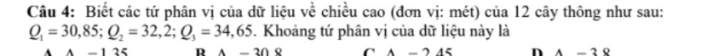 Câu 4: Biết các tứ phân vị của dữ liệu về chiều cao (đơn vị: mét) của 12 cây thông như sau: