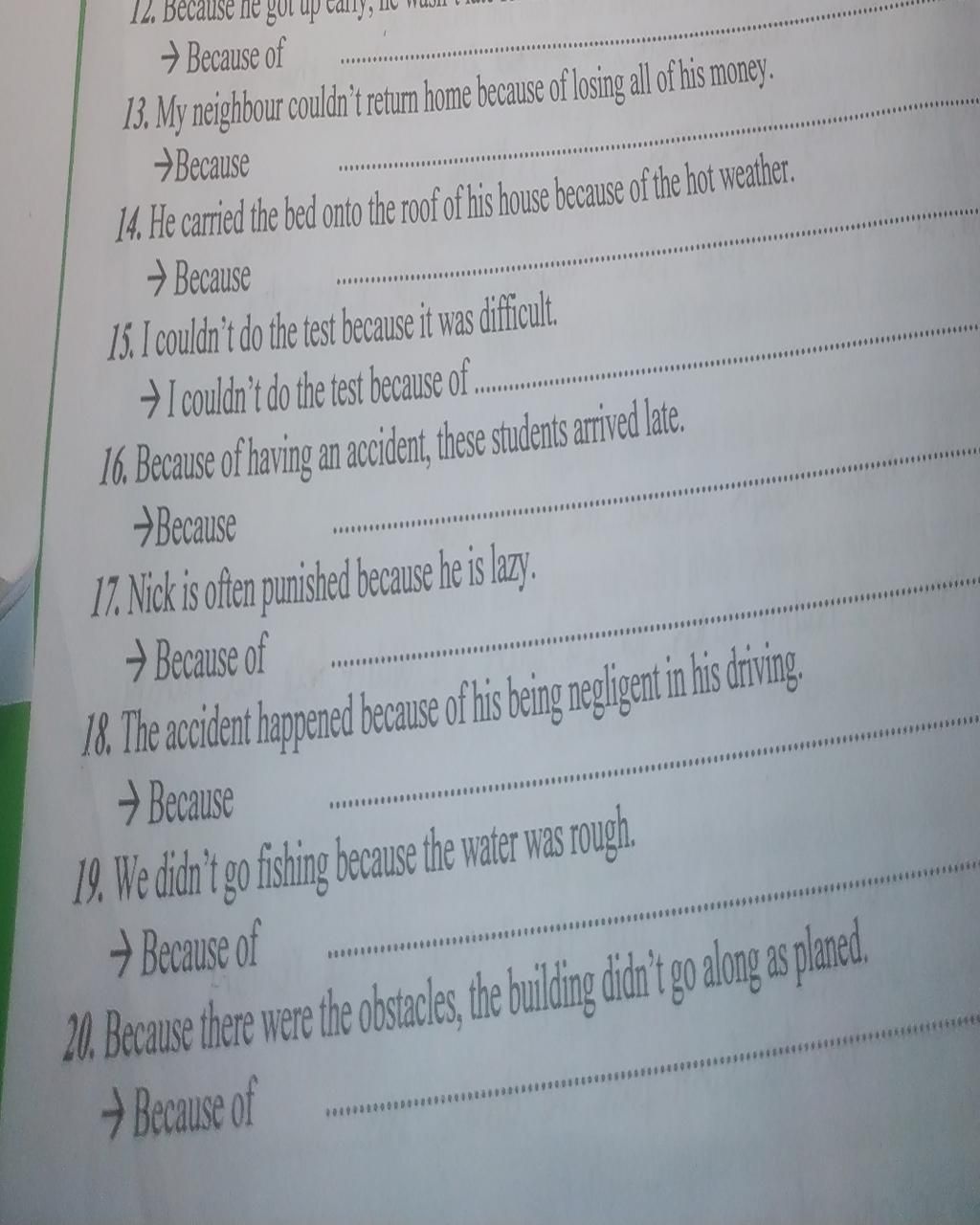 13. Because my neighbour lost all of his money, he couldn't return home.