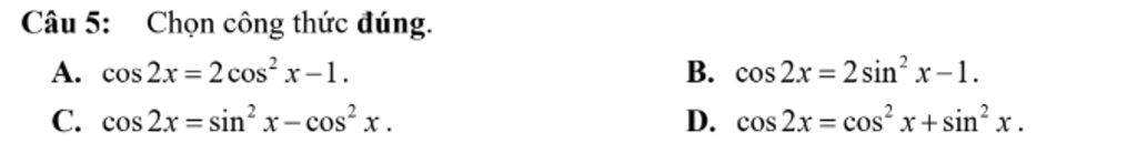 Ta có : `cos2x = cos^2x - sin^2x = 2 cos^2x - 1 = 1 - 2sin^2x`