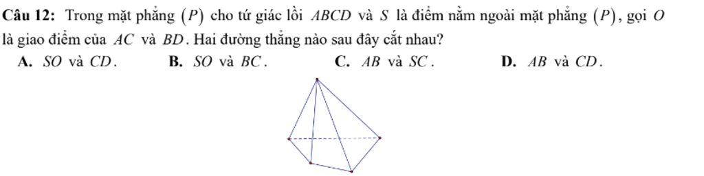Câu 12: Trong mặt phẳng $(P)$ cho tứ giác lồi $A B C D$ và $S$ là điểm nằm ngoài mặt phẳng $(P)$, gọi $O$ là giao điểm của $A C$ và $B D$. Hai đường thẳng nào sau đây cắt nhau?