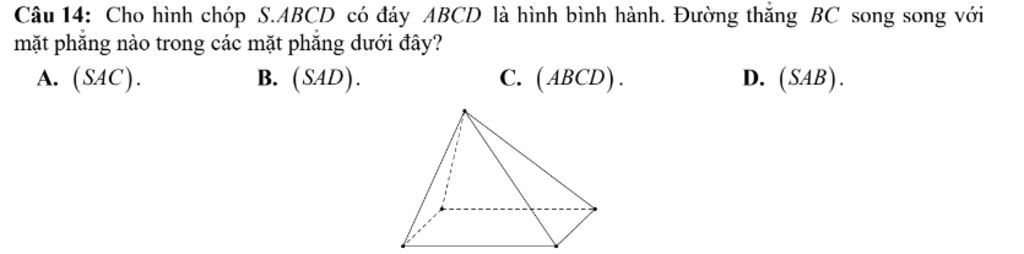 Câu 14: Cho hình chóp $S . A B C D$ có đáy $A B C D$ là hình bình hành. Đường thẳng $B C$ song song với mặt phẳng nào trong các mặt phẳng dưới đây?