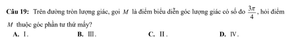 Do `M` được biểu diễn tại góc lượng giác có số đo là : `(3pi)/4`