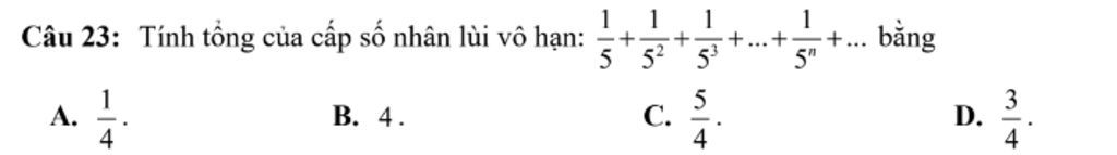 Dãy số trên là 1 cấp số nhân lùi vô hạn với `q=1/5`, `u_1=1`