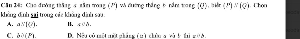Câu 24: Cho đường thẳng $a$ nằm trong $(P)$ và đường thẳng $b$ nằm trong $(Q)$, biết $(P) / /(Q)$. Chọn khẳng định sai trong các khẳng định sau.