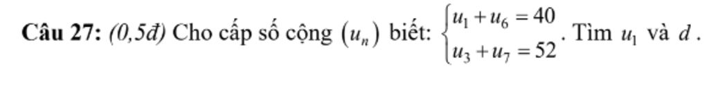 `-> {(u_1+u_1+5d=40),(u_1+2d+u_1+6d=52):}`