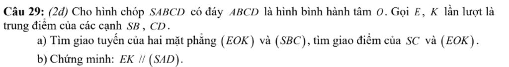 Câu 29: $(2 d)$ Cho hình chóp $S A B C D$ có đáy $A B C D$ là hình bình hành tâm $O$. Gọi $E, K$ lần lượt là trung điểm của các cạnh $S B, C D$.