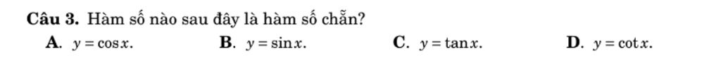 `A. y = cos x:` Đây là hàm chẵn vì `cos(-x) = cos(x).`