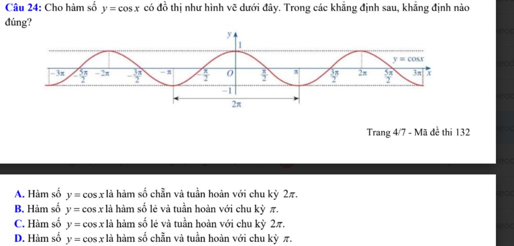 Câu 24: Cho hàm số y=cosx có đồ thị như hình vẽ dưới đây. Trong các khẳng định sau, khẳng định nào