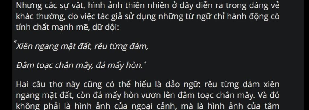 `→` Nhưng các sự vật, hình ảnh thiên nhiên ở đây ... mạnh mẽ, dữ dội : "Xiên ngang mặt đất, rêu từng đám `/` Đâm toạc chân mây, đá mấy hòn". Hai câu thơ này cũng ...