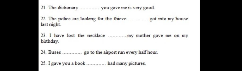 22. The police are looking for the thieves who got into my house last night. =>Who sử dụng làm chủ ngữ, tân ngữ hoặc có thể thay thế cho các danh từ chỉ người. Vế sau bổ ngữ cho danh từ chỉ người đứng trước