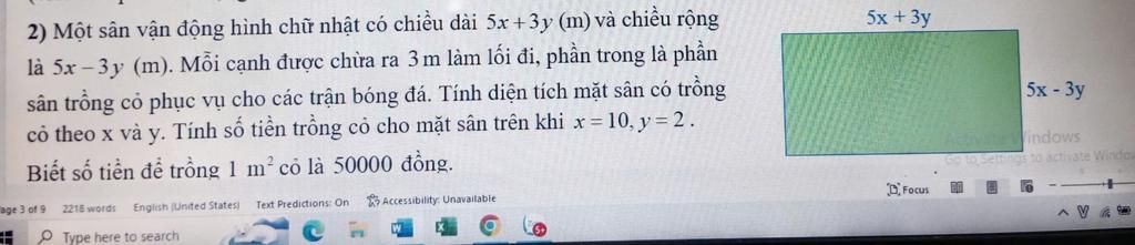 Khi `x = 10 ; y = 2` thì diện tích mặt sân có trồng cỏ là: