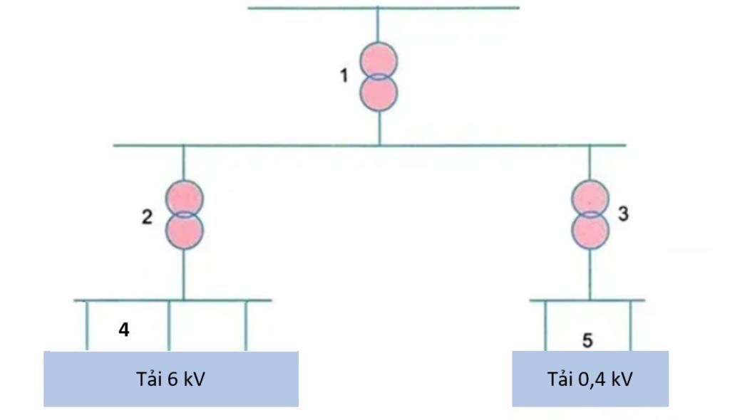+ Nhánh (3) cấp cho tải 0,4 kV → như vậy, nó phải có máy biến áp trung gian hạ điện áp xuống mức thấp phù hợp cho phụ tải dân dụng hoặc công nghiệp nhẹ.