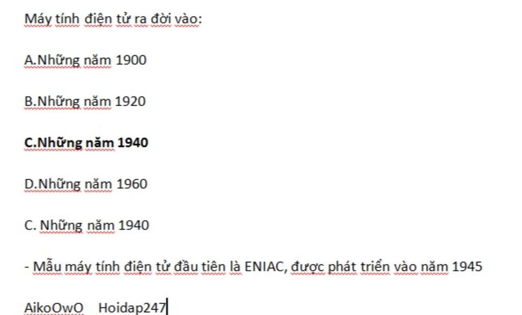 Máy tính điện tử ra đời vào:A.Những năm 1900B.Những năm 1920C.Những năm 1940D.Những năm 1960Giúp mình vs aaa