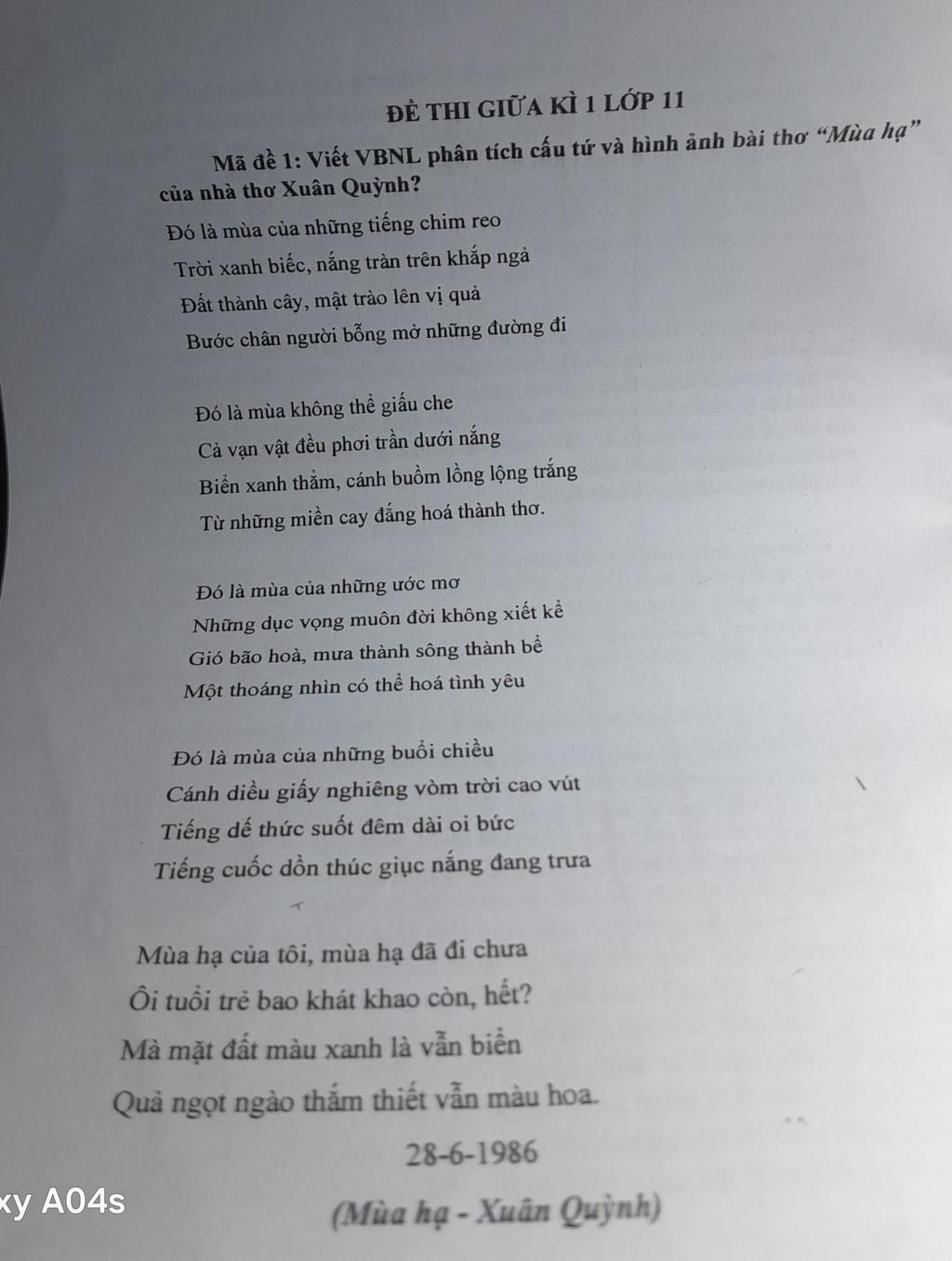 Viết VBNL phân tích cấu tứ và hình ảnh bài thơ " mùa hạ" của nhà thơ xuân quỳnh