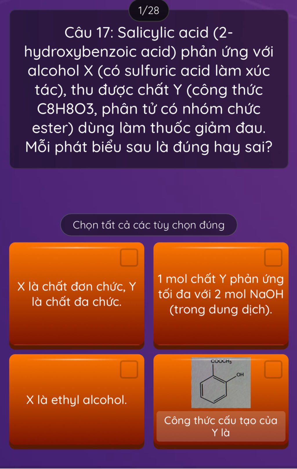 Salicylic acid (2-hydroxybenzoic acid) phản ứng với alcohol X (có sulfuric acid làm xúc tác), thu được chất Y (công thức