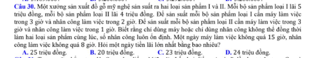 Câu 30. Một xưởng sản xuất đồ gỗ mỹ nghệ sản xuất ra hai loại sản phẩm I và II. Mỗi bộ sản phẩm loại I lãi 5 triệu đồng, mỗi bộ sản phẩm loại II lãi 4 triệu đồng. Để sản xuất mỗi bộ sản phẩm loại I cẩn máy làm việc trong 3 giờ và nhân công làm việc trong 2 giờ. Để sản xuất mồi bộ sản phẩm loại II cần máy làm việc trong 3 giờ và nhân công làm việc trong 1 giờ. Biết rằng chỉ dùng máy hoặc chỉ đùng nhân công không thể đồng thời làm hai loại sản phẩm cùng lúc, số nhân công luôn ổn định. Một ngày máy làm việc không quá 15 giờ, nhân công làm việc không quá 8 giờ. Hỏi một ngày tiền lãi lớn nhất bằng bao nhiêu?