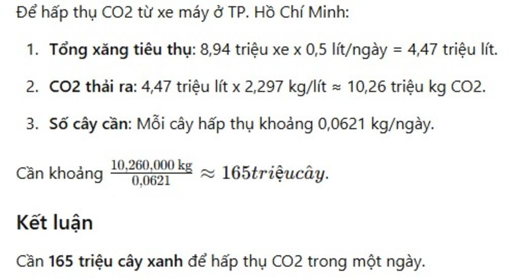 Trung bình 1 lít xăng sẽ thải khoảng 2,297kg CO2 vào khí quyển từ động cơTheo nghiên cứu thì một cây xanh trưởng thành tiêu thụ 22,7kg CO, trong một năm (365 ngày). Tính đến ngày 15/06/2019, Thành phố Hồ Chí Minh có 8,94 triệu xe máy cá nhân. Giả sử trung bình mỗi ngày một chiếc xe tiêu thụ 0,5 lít xăng. Hôi cần ít nhất bao nhiêu cây xanh để hấp thụ hết lượng khỉ CO, của xe máy thái ra trong 1 ngày