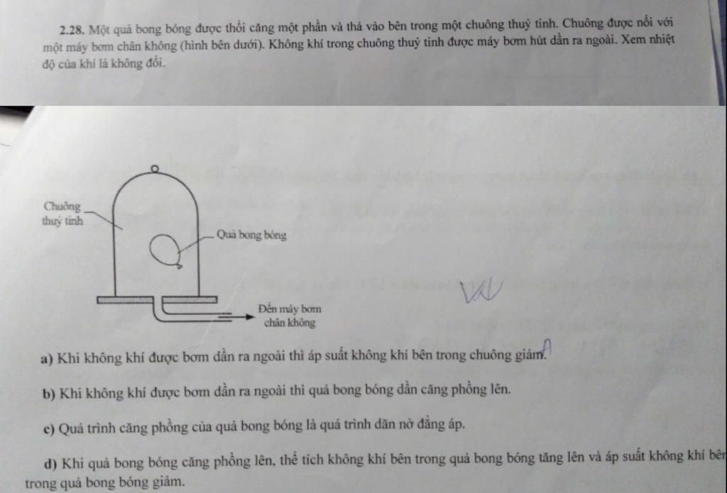 C. Ban đầu thì là đẳng áp do áp suất cân bằng nhưng sau khi không khí bị bơm dần ra ngoài → áp suất trong chuông giảm ⇔ áp suất bên ngoài bóng giảm nên có sự thay đổi áp suất sau đó để cân bằng với áp suất bên ngoài => Sai không phải đẳng áp