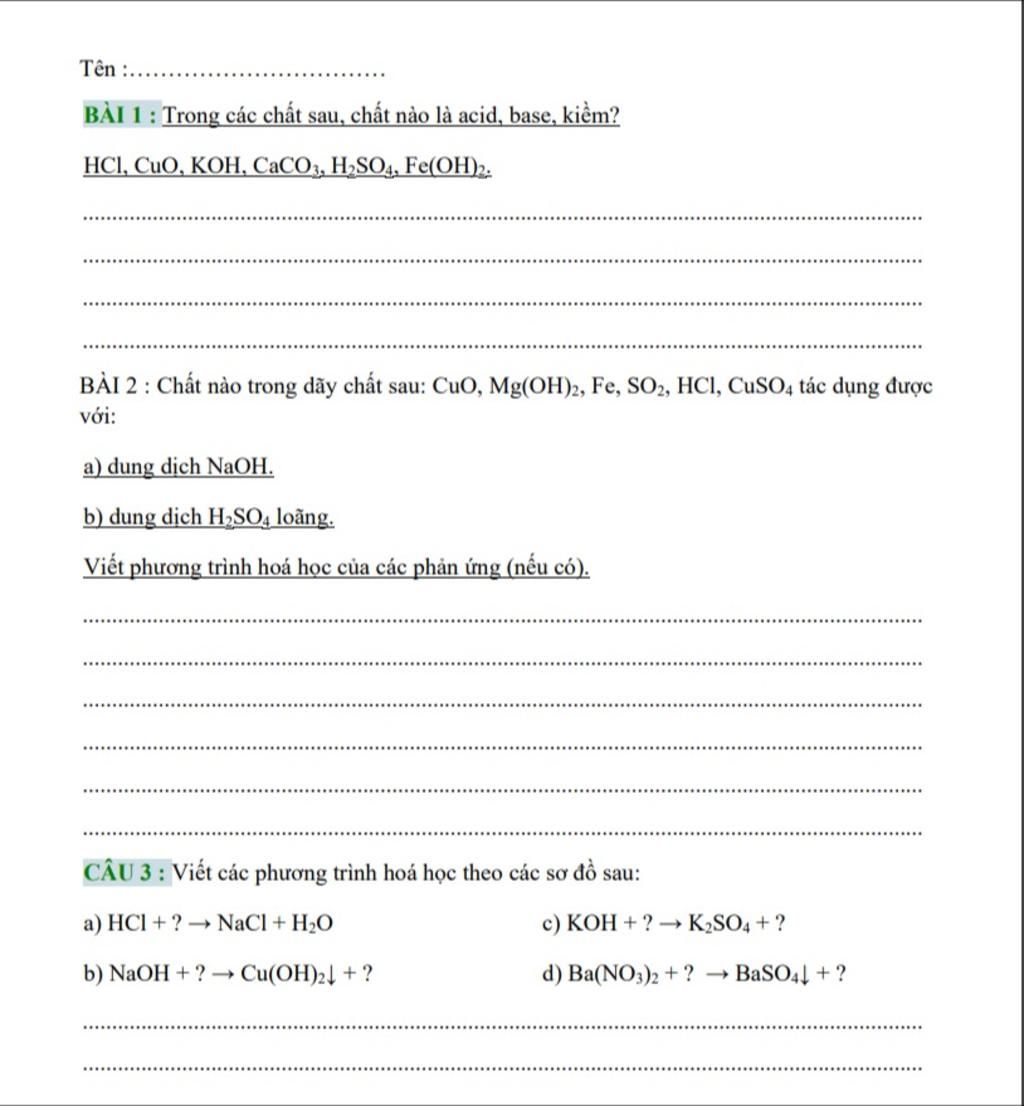 BÀI 1 : Trong các chất sau, chất nào là acid, base, kiềm?