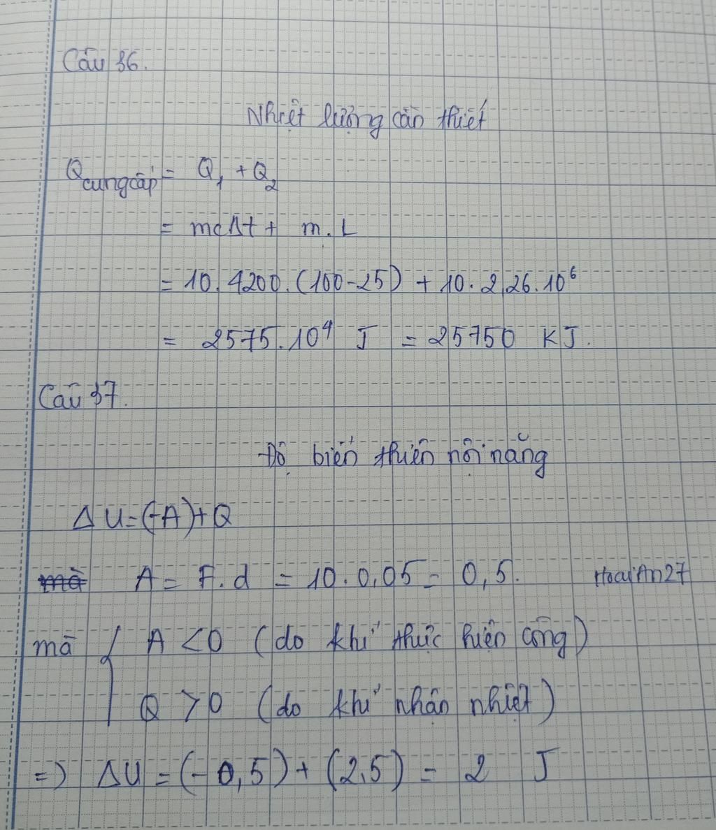 Câu 36. Tính nhiệt lượng cần thiết để làm cho 10 kg nước ở 25°C chuyển hoàn toàn thành hơi ở 100°C. Cho nhiệt dung riêng là 4200J/kg.K; nhiệt hóa hơi riêng của nước là 2,26.10⁶ J/kg.