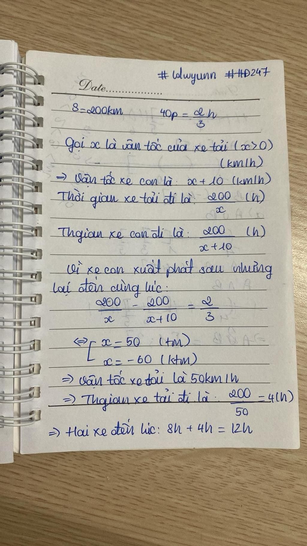 Thời gian xe tải đi là: `200/x` `= 200/50` `= 4` (giờ)