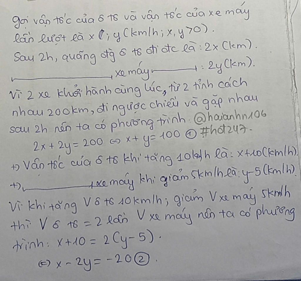 một ô tô và xe máy khởi hành cùng một lúc từ 2 tỉnh khác nhau cách 200km , đi ngược chiều và gặp nhau sau 2h .Tìm vận tốc của ô tô và xe máy , biết rằng nếu vận tốc của ô tô tăng thêm 10km/h và vận tốc xe máy giảm đi 5km/h thì vận tốc của ô tô bằng hai lần vận tốc của xe máy