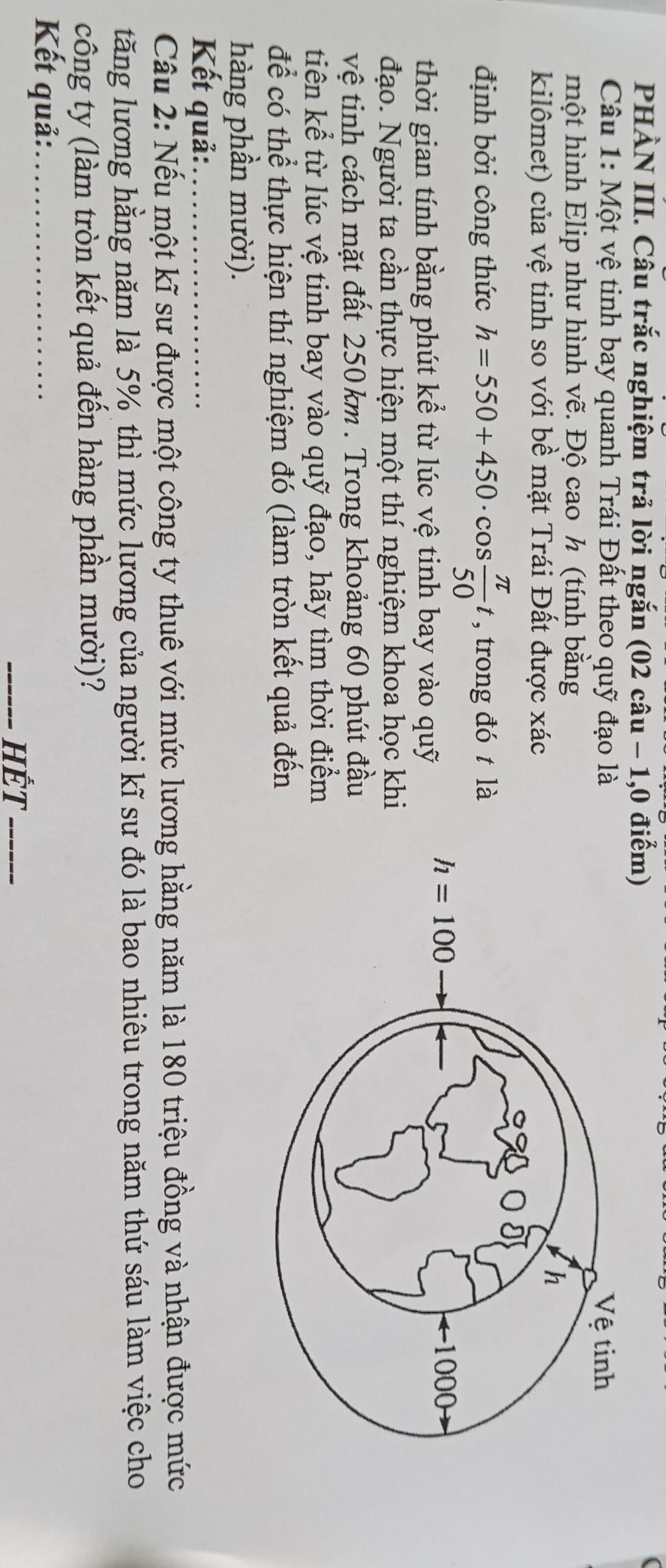 PHẦN III. Câu trắc nghiệm trả lời ngắn (02 câu – 1,0 điểm)