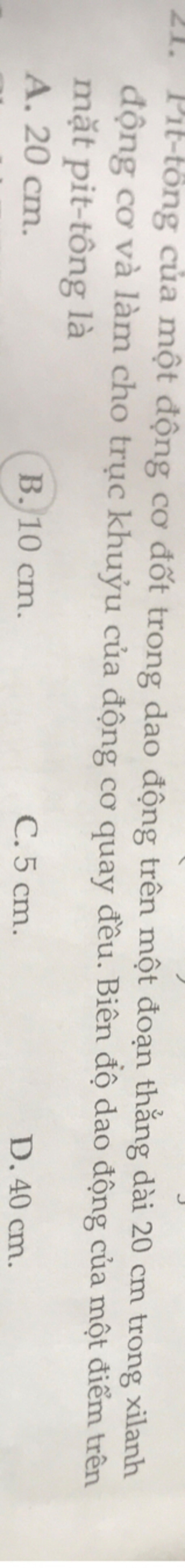 ⇒Biên độ dao động của một điểm trên mặt pit-tông là : `A=L/2={20}/2=10` cm