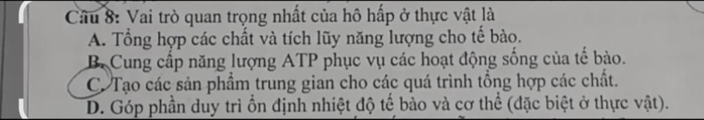 Đáp án đúng: B. Cung cấp năng lượng ATP phục vụ các hoạt động sống của tế bào.