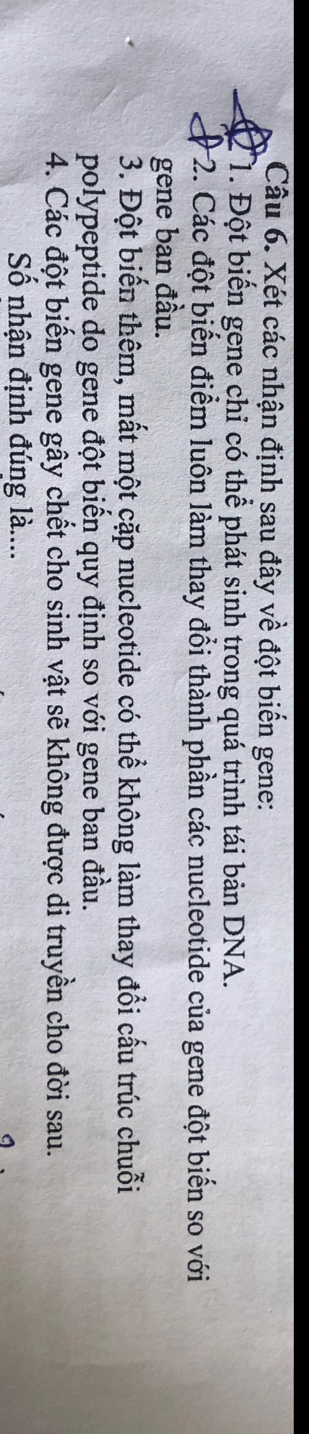 4. Sai.Dù một đột biến gây chết cho sinh vật, nếu nó xảy ra trong tế bào sinh dục, đột biến vẫn có thể được di truyền cho thế hệ sau.