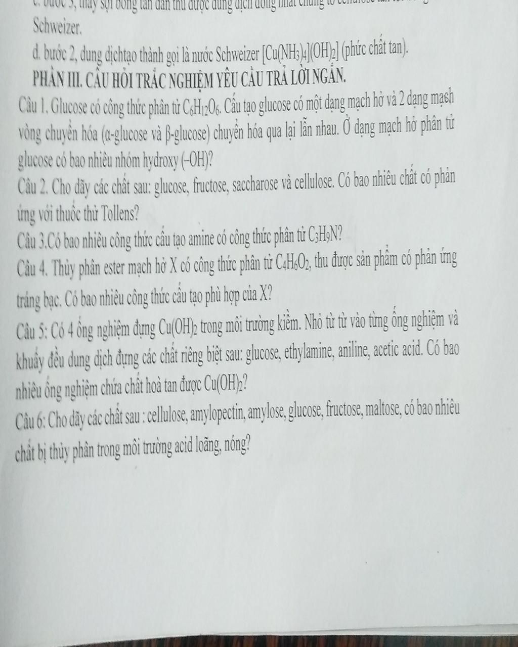 Câu I. Glucose có công thức phân tử C.HirO. Cấu tạo glucose có một dạng mạch hở và 2 dạng mạch