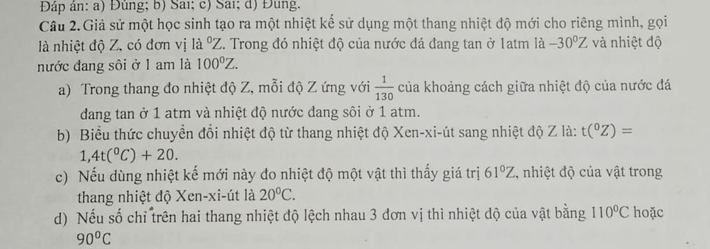 Câu 2. Giả sử một học sinh tạo ra một nhiệt kế sử dụng một thang nhiệt độ mới cho riêng mình, gọi