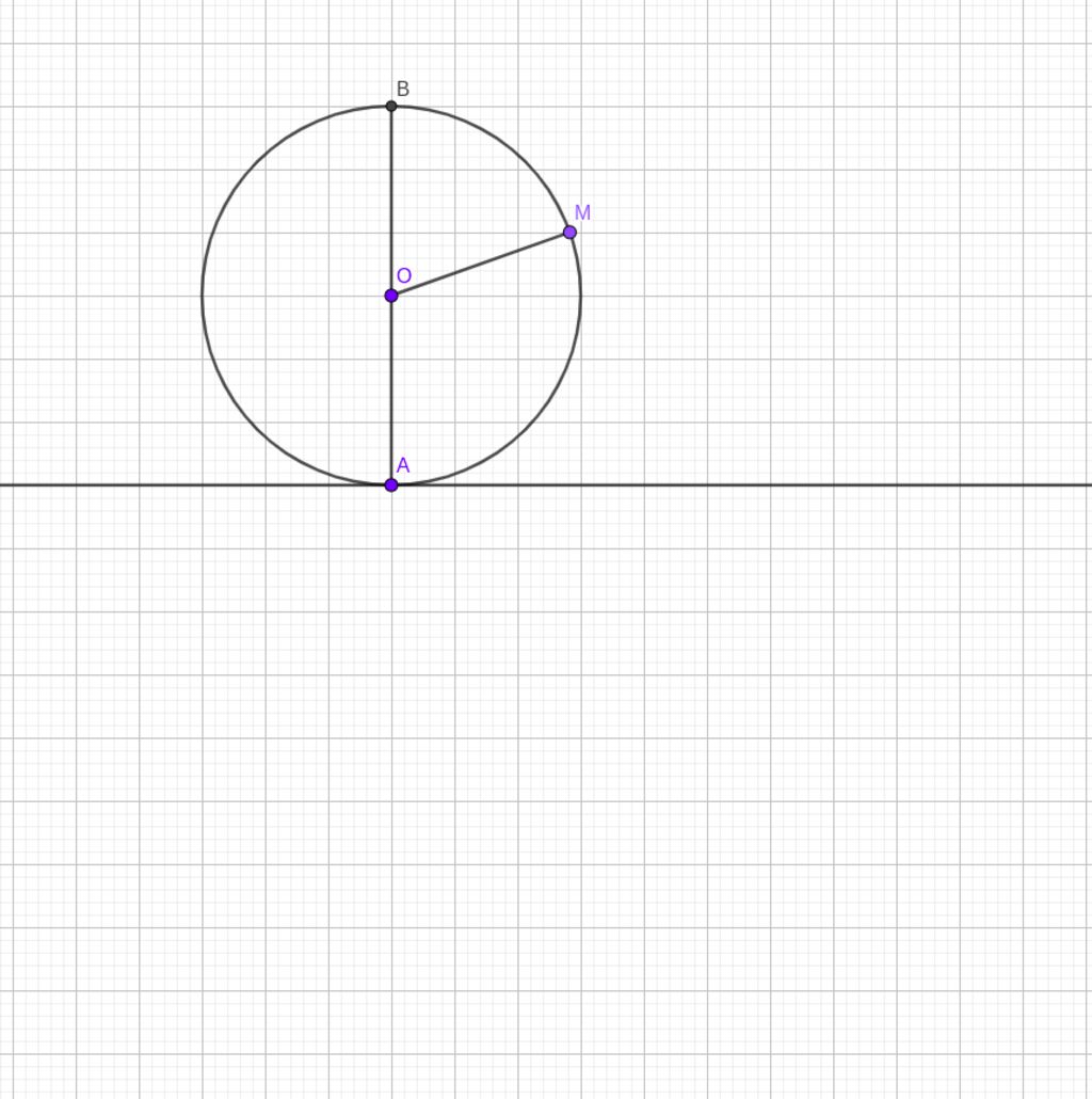 Một cái guồng nước có vành kim loại ngoài cũng là một đường tròn tâm O, bán kính là 4m. Xét chất điểm M thuộc đường tròn đó và góc alpha =(OA,OM). Giả sử mực nước lúc đang xét là tiếp xúc với đường tròn (O,4) và guồng nước quay theo chiêu dương (ngược chiếu kim đồng hồ).