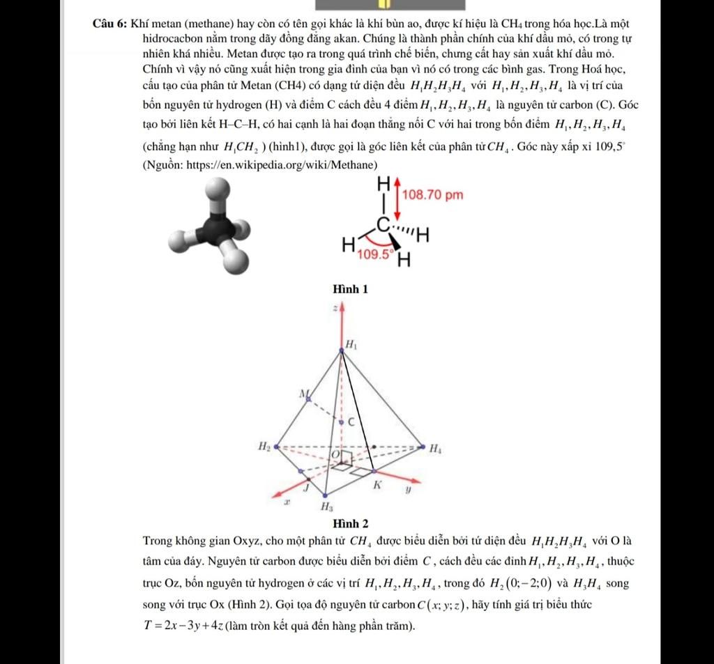 Câu 6: Khí metan (methane) hay còn có tên gọi khác là khi bùn ao, được kí hiệu là CH4 trong hóa học.Là một