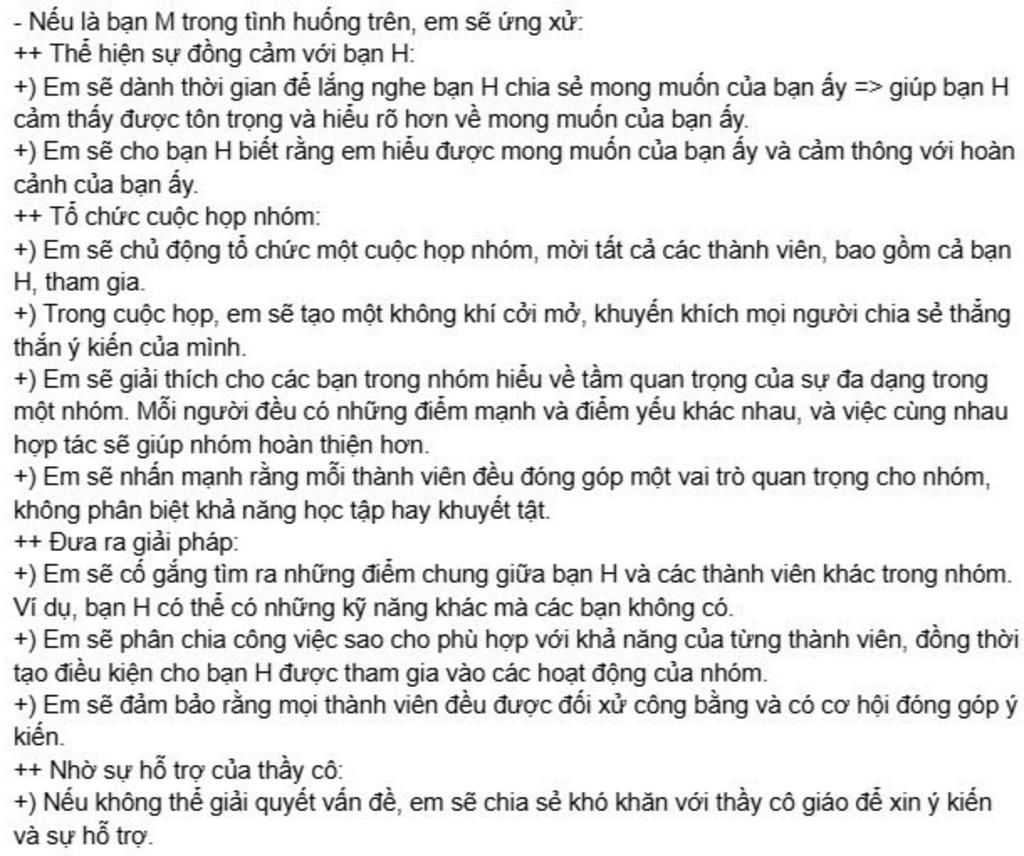 - Em sẽ nhẹ nhàng trao đổi với các bạn trong nhóm để mọi người hiểu rằng ai cũng có quyền được tham gia và không nên đánh giá H chỉ vì học chưa khá hoặc bị khuyết tật.