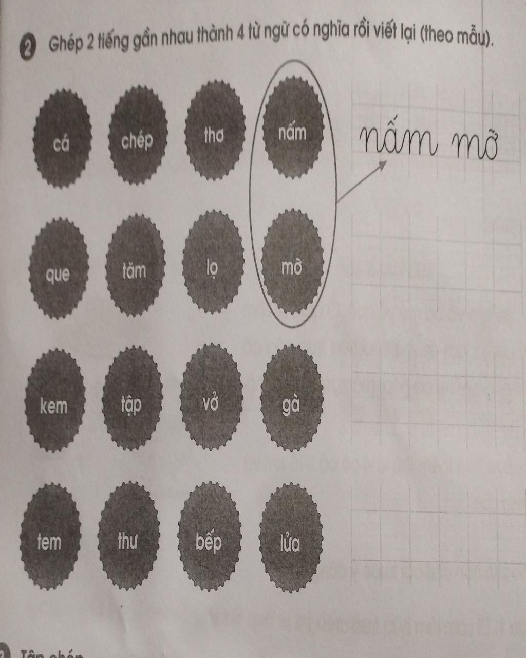 Ghép 2 tiếng gần nhau thành 4 từ ngữ có nghĩa rồi viết lại( theo mẫu )