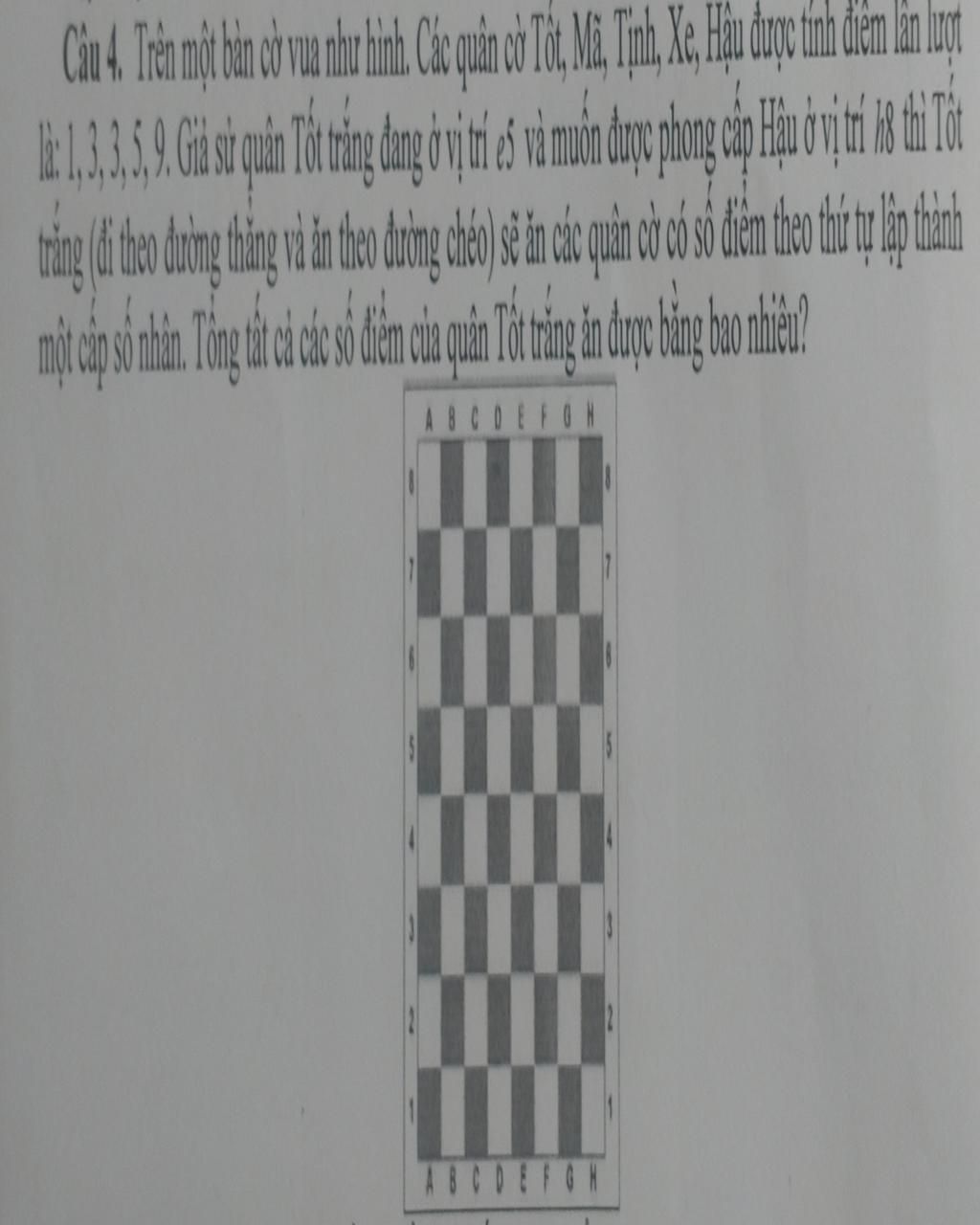 Trên một bàn cờ vua như hình. Các quân cờ Tốt, Mã, Tịnh, Xe, Hậu được tính điểm lần lượt là:1,3,3,5,9 .Giả sử quân Tốt trắng đang ở vị trí e5 và muốn được phong cấp Hậu ở vị trí h8 thì Tốt trắng (đi theo đường thẳng và ăn theo đường chéo ) sẽ ăn các quân cờ có số điểm theo thứ tự lập thành một cấp số nhân. Tổng tất cả các số điểm của quân Tốt trắng ăn được bằng bao nhiêu?