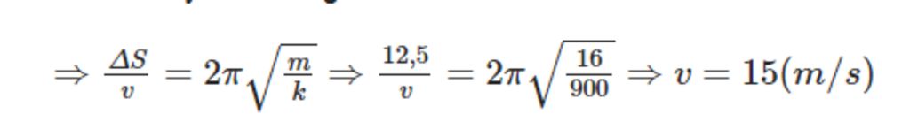 `-> v = (Δs)/(2π.\sqrt{m/k}) = (12,5)/(2π.\sqrt{16/900}) ≈ 14,92 (m//s)`