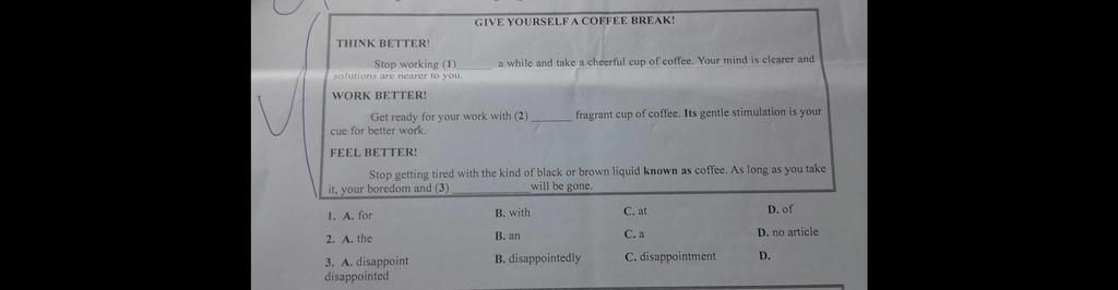 `-` ''Fragrant cup of coffee'' là danh từ lần đầu được nhắc đến, danh từ số ít đếm được bắt đầu bằng phụ âm.