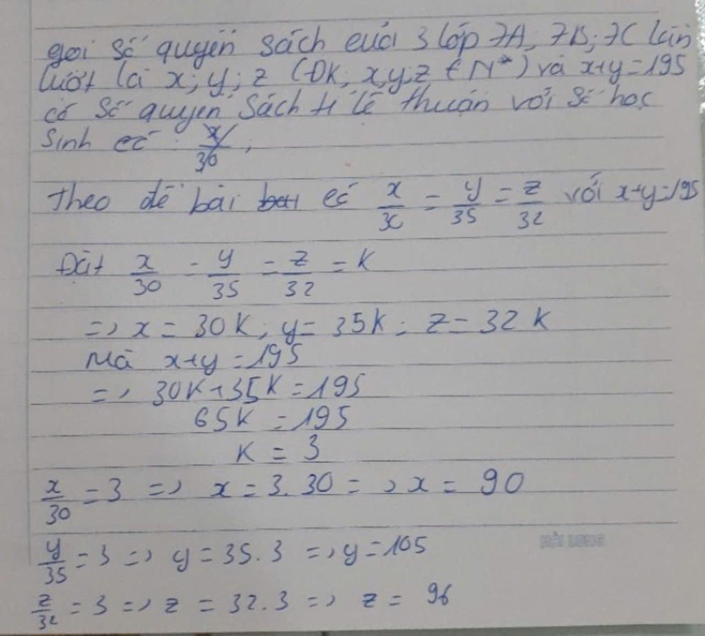 và 7 C của trường THCS X đã thực hiện quyên góp sách để giúp đỡ các bạn học sinh có hoàn cảnh khó khăn. Lớp 7A có 30 học sinh, lớp 7B có 35 học sinh, lớp 7C có 32 học sinh. Số sách ba lớp quyên góp được tỉ lệ với số học sinh của mỗi lớp. Hỏi mỗi lớp quyên góp được bao nhiêu quyển sách, biết rằng tổng số sách hai lớp 7 A và 7 B quyên góp được là 195 quyển.