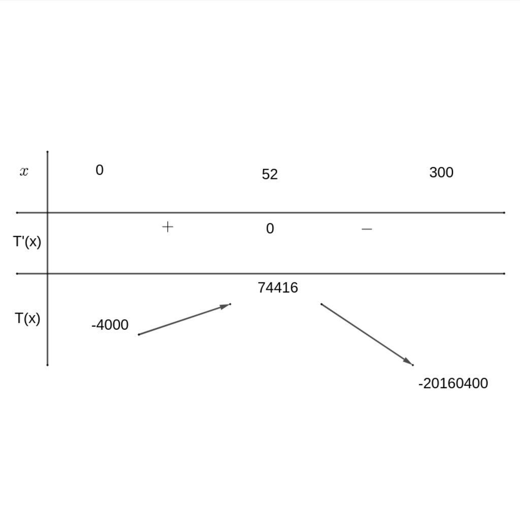 $\to$Lợi nhuận lớn nhất doanh nghiệp đạt được là $74416$ triệu đồng khi sản xuất $52$ sản phẩm