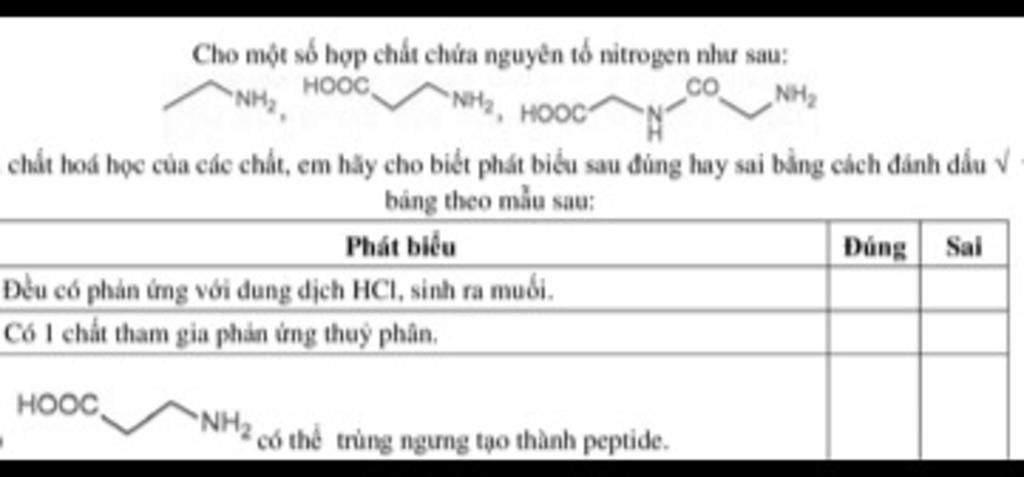 Chất đầu tiên là một amine, không tham gia phản ứng thuỷ phân. Chất thứ 2 là amino acid, cũng không tham gia. Chất thứ 3 là dipeptide, có thể tham gia phản ứng thuỷ phân.