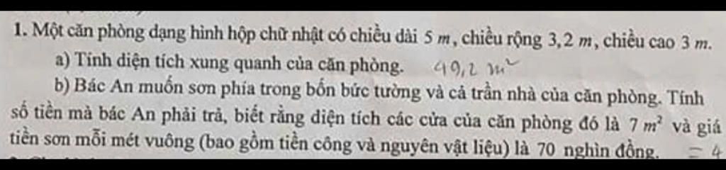 Số tiền bác An phải trả để sơn `4` bức tường và cả trần nhà của căn phòng là :