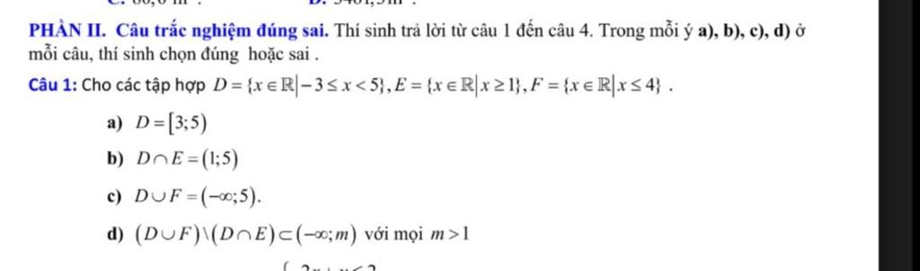 Câu 1: Cho các tập hợp D= {x=R|-3≤x<5},E={v=R|r>l},F = {x=R|x≤4} .